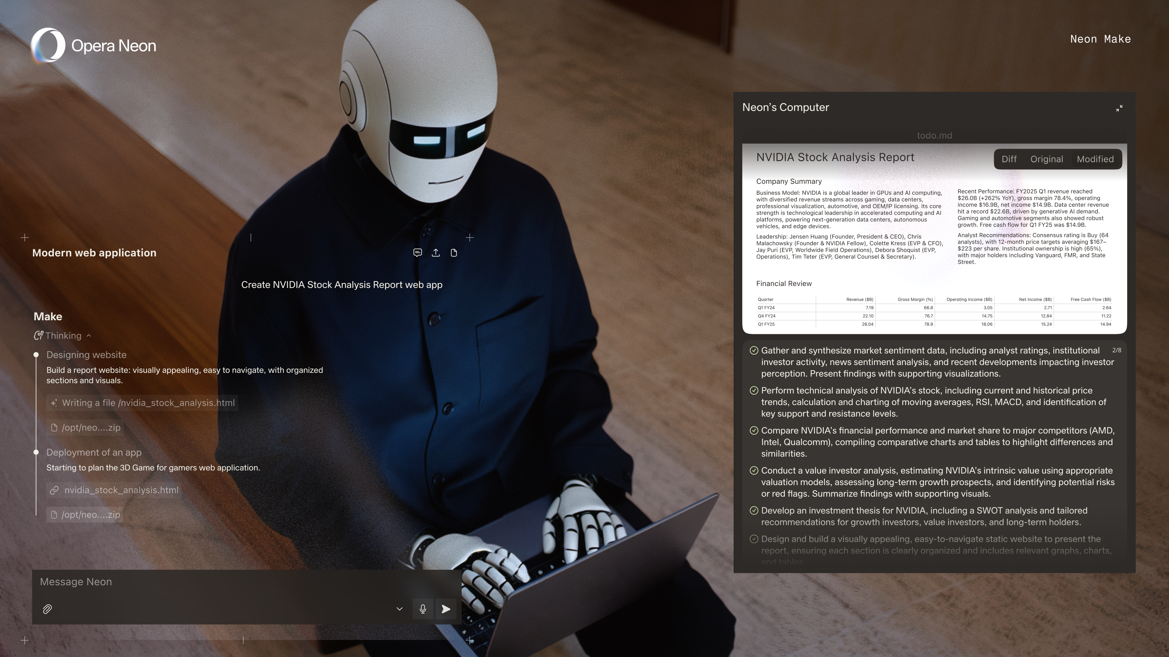 Opera Neon, tamamen ajan bir tarayıcı deneyimi sunuyor. Neon Do özelliği sayesinde, yeni sekmeler açılabiliyor, mevcut sekmeleri kapatılabiliyor ve bunlar arasında çeşitli işlemleri gerçekleştirilebiliyor. Üstelik tüm bu adımları her zaman belirli bir Görev (Task) bağlamında yerine getiriliyor. Neon Do, diğer yapay zekâ asistanlarının yapamadığını yapıyor. Yalnızca bulutta değil, tarayıcınızın içinde çalışıyor.